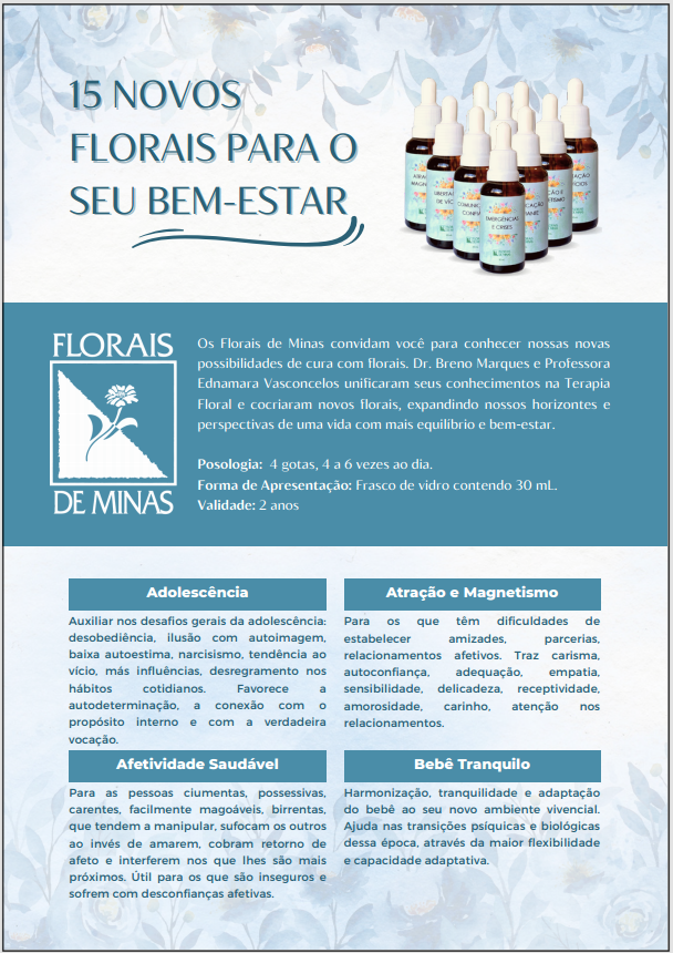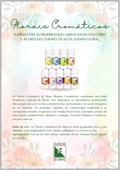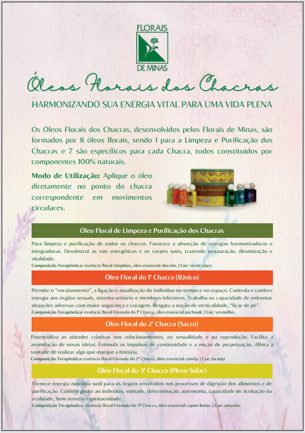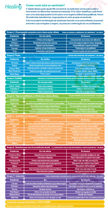 Florais do Sistemas Agnes, Alaska, Amazônia, Arco-íris, Australiano Bush, Australiano Living, Bach, Californiano, Deva, Deserto, Filhas de Gaya, Hawaí, Himalaya, Holanda, Minas, Nona Essência, Pacífico, Rain Forest e Saint Germain.